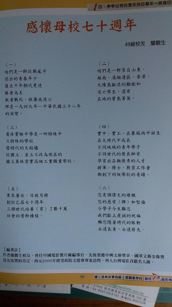 蘭觀生 河南襄城人,生於山東濟南,成長於台灣。經歷: 中國電影製片廠編導官。 國立復興戲劇學校,兼任教授。 國防大學戲劇系兼任教授。 從事編導與教學30餘年,是一個專業工作者。 上海中醫師特考合格。