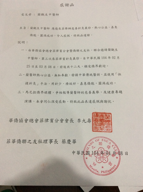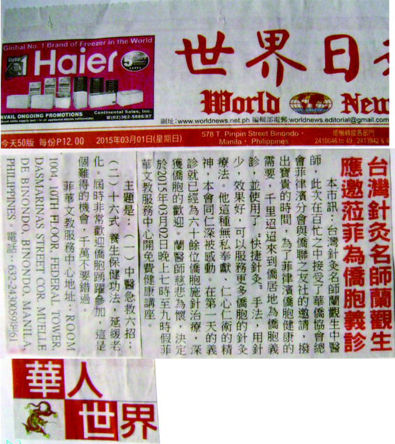 應邀赴菲律賓針灸義診