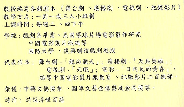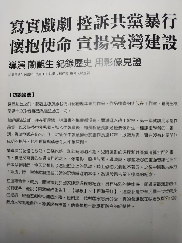 蘭觀生 河南襄城人,生於山東濟南,成長於台灣。經歷: 中國電影製片廠編導官。 國立復興戲劇學校,兼任教授。 國防大學戲劇系兼任教授。 從事編導與教學30餘年,是一個專業工作者。 上海中醫師特考合格。