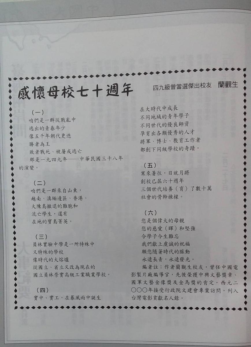 蘭觀生 河南襄城人,生於山東濟南,成長於台灣。經歷: 中國電影製片廠編導官。 國立復興戲劇學校,兼任教授。 國防大學戲劇系兼任教授。 從事編導與教學30餘年,是一個專業工作者。 上海中醫師特考合格。